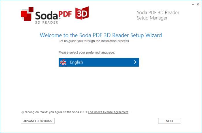 3.双击打开,进入Soda PDF 3D Reader软件界面,选择安装语言,点击下一步