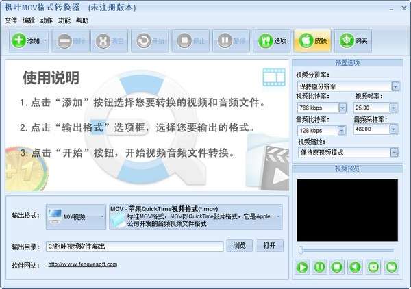 《枫叶MOV格式转换器》是一款功能强大的MOV格式转换软件,能将MOV格式转换为MP4、AVI、MPG、3GP、FLV、DVD、MKV、VCD、SWF等等几十种流行视频格式。可以方便的转换QuickTime HD高清MOV格式视频为您所需要的各种HD高清视频格式和标清格式。当然您也可以将目前流行的近百种视频格式转换为MOV格式。如AVI格式转换为MOV格式、MP4转换为MOV格式、MPEG,MPG,WMV,RMVB转换为MOV格式。可以将MOV格式转换为iPad、iPhone、iPod、PSP、MP4播放机、Android安卓手机所支持的高清MP4视频,方便在各种便携移动设备上播放。还支持将MOV格式转换为流行的MP3、WMA、WAV音频格式。由于采用独创解码技术,所以转换速度极快、转换画面质量极高,转换后的视频和原视频同样清晰流畅。支持批量转换,支持视频转换同时预览,可同时转换多个视频文件。