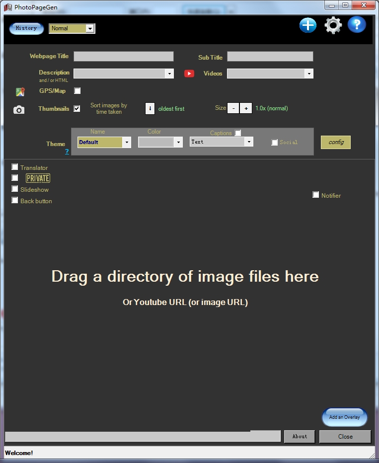 photopagegen有一个在一个窗口中包含所有选项的界面,您可以轻松创建图片库,只需拖放包含所需照片、图像的url或youtube url的目录即可。换句话说,应用程序可以处理在线视频和本地存储的图片。