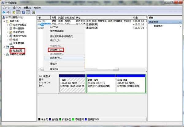 3、接下来,选择你需要分割的盘。点击鼠标右键,选择压缩卷。(这一步是为了腾出可分割空间用的)。