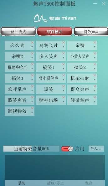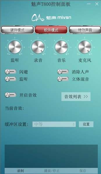 魅声t800控制面板是一款非常全面的声卡驱动软件,为用户提供超强的声卡升职功能,软件为用户提供了硬件模式和软件模式,不同的模式可以设置调整不同的参数,达到不同的音效和声音输出效果。除此之外软件还为用户提供了已经设置好特效声音,超多方案其中包括,电音、变音回荡、双音、闪避、爆音等多种效果,让你的声卡发挥极致的性能,让你的声音百变。