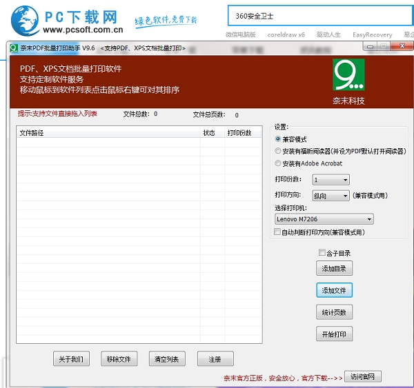 奈末pdf批量打印助手官方版是一款界面直观专业出众使用便捷的PDF、Xps文档的批量打印工具。奈末PDF批量打印助手官方版可以帮助用户将多个PDF、XPS文档快速进行批量打印并支持设置打印模式、打印份数、打印方向等参数且无需打开文件即可打印。奈末PDF批量打印助手内置PDF/XPS统计页数功能,方便用户进行更好的分页打印。