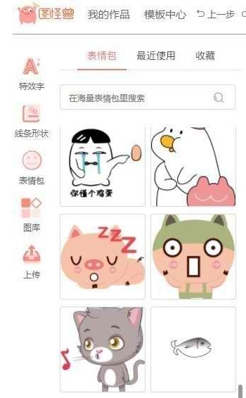 文字更换完毕后又可以在左侧增加特效字、线条形状和表情包等操作;如果自己有本地的图片也可以通过上传来对图片进行相对应的设计;
