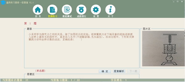数据库中只保存图片路径,格式(八年级科学题目编码.jpg),图片存放在软件所在文件夹下的题库同名文件夹下(如软件所在文件夹为D:通用练习,题