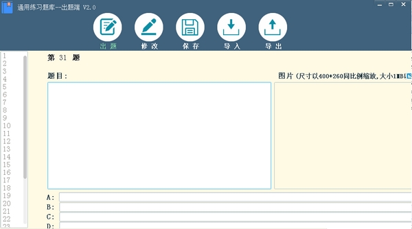 本软件提供出题端,可以自己添加题库,可以EXCEL导入导出,并支持图片,图片尺寸以400*260同比例缩放,大小1M以下为佳,否则容易变形或加载慢。