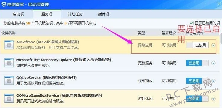 2、接下来我们要查看电脑上的安全卫士是否禁用了ADSafe净网大师,我们以电脑管家为例,如下图所示,进入到电脑管家启动项管理界面进行查看,如果显示已禁用,那么我们需要开启这个选项。