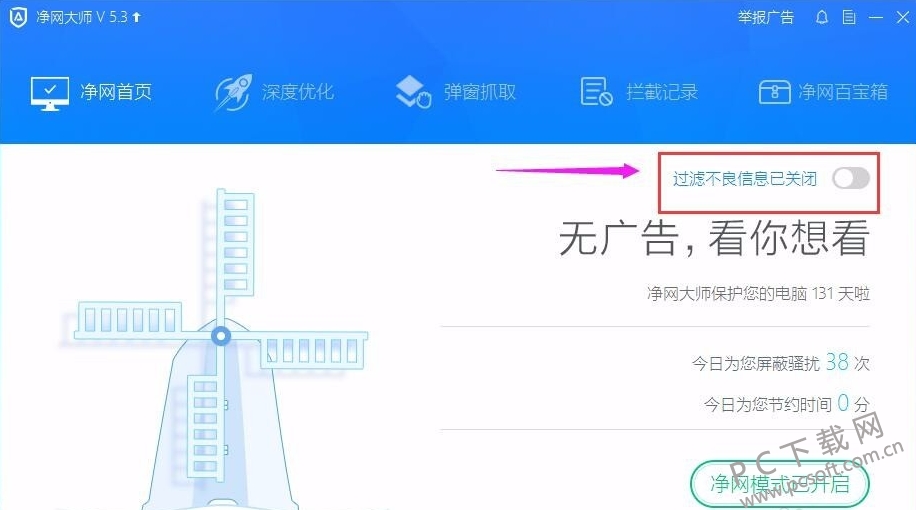 1、首先我们先打开安装好的ADSafe净网大师软件,接下来进入到软件的主界面,如下图所示,我们先查看界面的“过滤不良信息”选项是否开启,如果显示的是已关闭那么我们需要开启该选项。