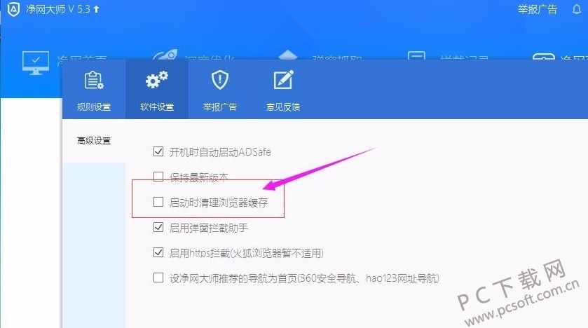 3、接下来我们需要清除ADSafe净网大师软件的缓存,我们进入到软件下图中的界面,然后勾选“启动的清理浏览器缓存”选项,接下来关闭软件后重启ADSafe净网大师。