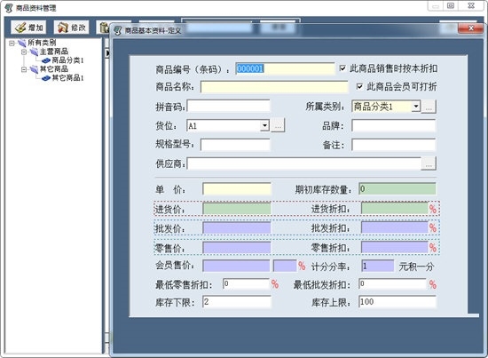 您可设置一类商品一个折扣,也可设置一件商品一个折扣,更可设置一类商品一个折扣,部分商品独立折扣!这样方便管理,方便调价等制定营销策略。更有零售整单打折方案,如:四舍五入到角到元,舍去分钱等。