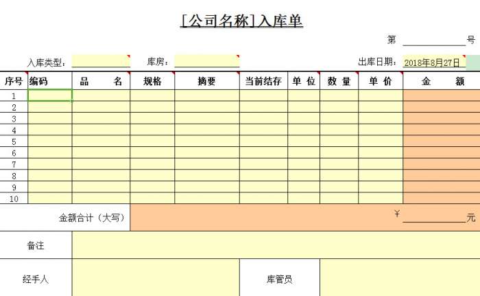 入库单模板,excel格式,包括品名、入库日期、数量、金额、单价、经手人等信息,简洁实用。有需要可在本站直接下载入库单模板。
