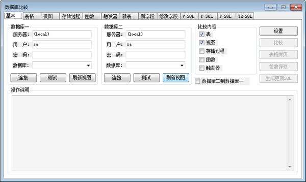数据库比较工具可以比较不同数据库实例之间结构的差异、表数据的差异以及过程函数之间的差异,支持MySql, Oracle, Sql Server 2000三种数据库,是一款非常实用的数据库应用工具。