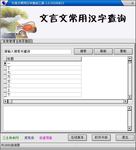 文言文翻译器官方版是一款相当出色的翻译工具。本站打包了两款供大家使用,文言文翻译器收集了几乎所有古文(文言文、八股文、诗歌、词典)中存在的古文汉字的解释。
