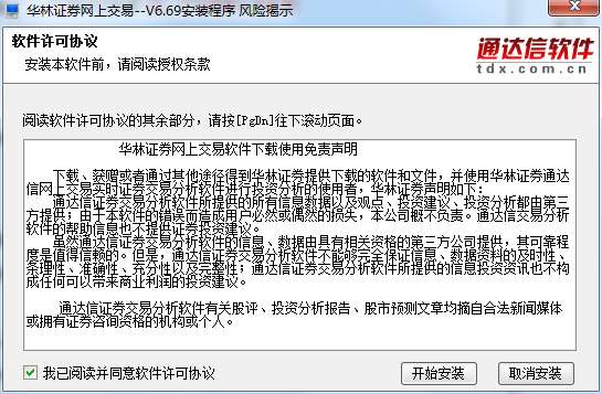 1、在PC下载网下载华林证券软件官方版这款软件的压缩包,解压后,双击exe文件,进入安装界面,查看软件许可协议,勾选“我已阅读并同意软件许可协议”,然后点击开始安装。