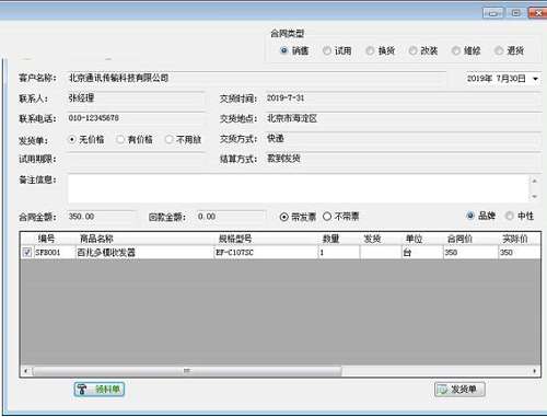 合同类型:销售、试用、换货。此时根据合同内容生成“生产单”或“领料单”。