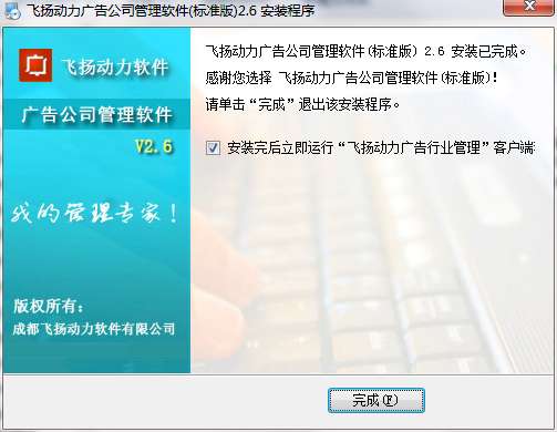 9.点击完成,飞扬动力广告公司管理软件安装成功