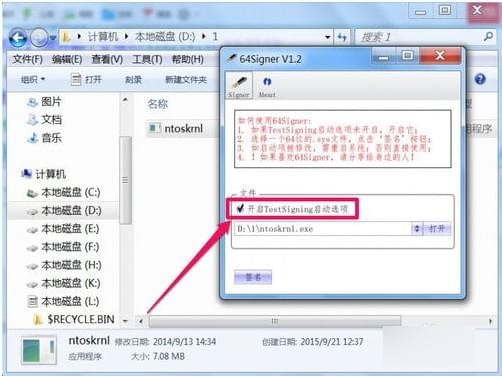 然后勾选“开启TestSigning启动选项”,默认会勾选,若没勾选,一定要勾选上。