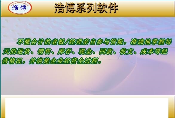 2、浩博进销存软件是市面上真正实现财务一体化的软件,是目前全球唯一能完全打印手工账簿式财务报表优秀软件,献给管理者最完美的报表, 强大的万能报表打印系统,用户可以随心所欲修改或添加打印模版。