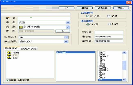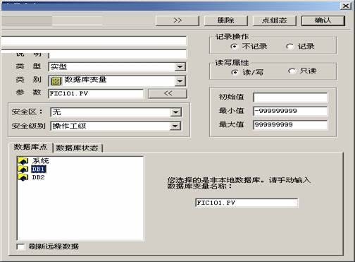 5、第一个变量命名为“DB1_FIC101.PV”,在“数据库点”中选择“DB1”,如果节点“Node1”没有启动,则手工输入“FIC101.PV”,“变量定义”对话框的形式