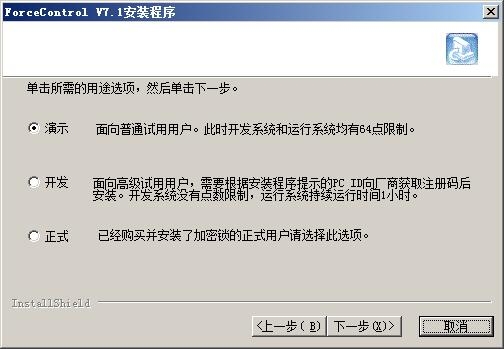 力控演示版的开发版和运行版分别有64点的限制,完全免费的不限点数的开发版可以直接咨询三维力控销售部和各地办事处,索要注册号即可以使用,力控正式发行的开发版没有点数和时间的限制,购买软件时,开发版随运行版免费赠送,运行版分为通用监控版、WWW网络版等。