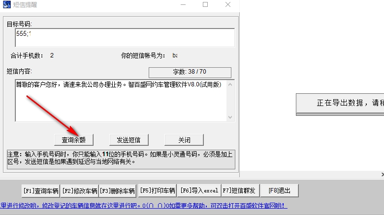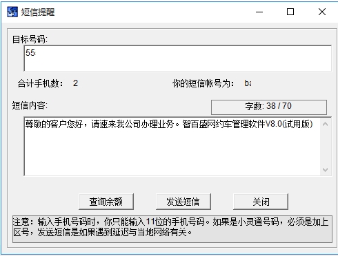 13、输入目标号码,输入文字内容:尊敬的客户您好,请速来我公司办理业务。智百盛网约车管理软件V8.0(试用版)