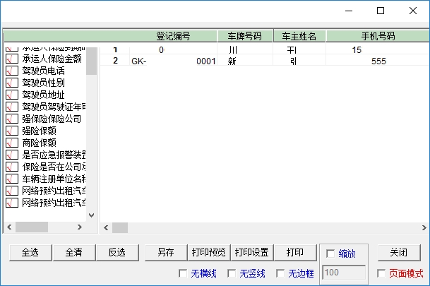 11、打印功能,对当前车辆信息打印,可以打印的条目在左侧修改