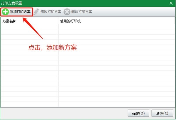 第二步:设置打印方案,点击工具栏“打印方案设置”按钮,弹出打印方案列表,点击“添加打印方案”按钮,新增打印方案,界面如下: