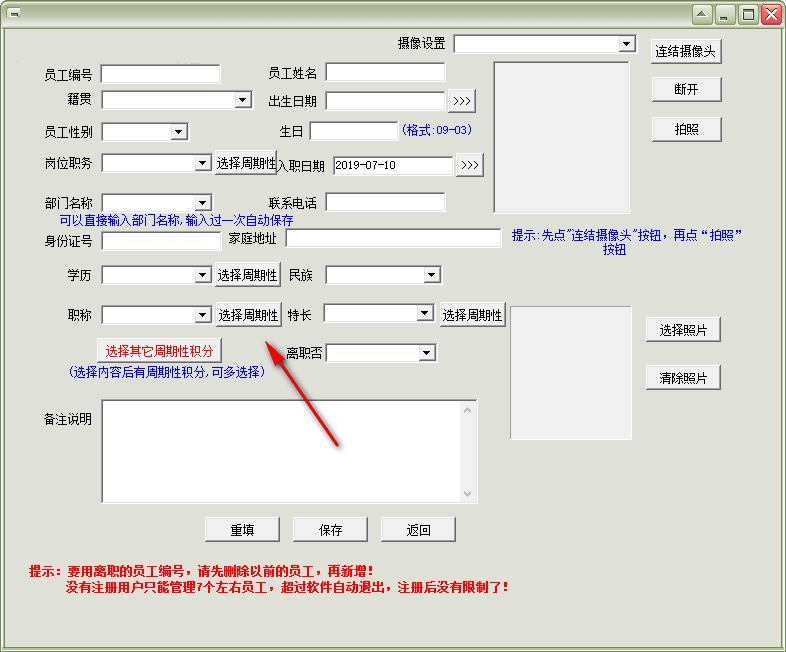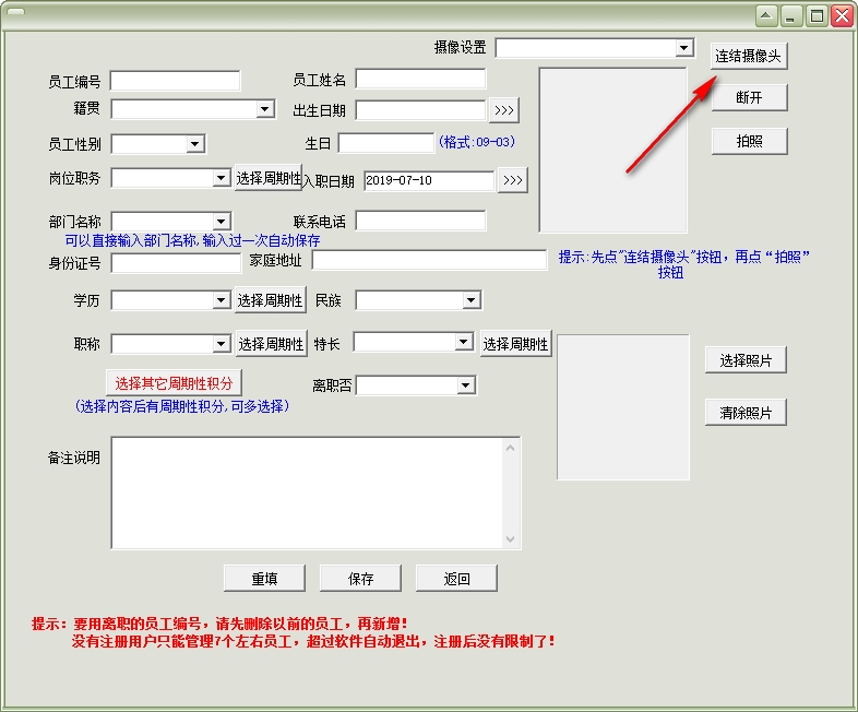 11、如果需要采集员工的头像就连接到摄像头,点击拍照就可以得到图片,也可以在下方“选择图片”