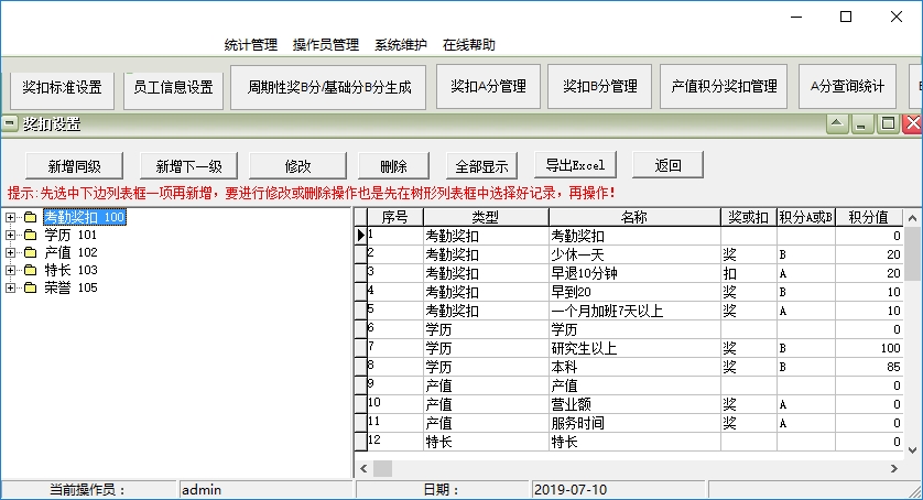 易达员工积分管理工资管理软件最新版是一款功能十分优秀的工作量统计软件,易达员工积分管理工资管理软件最新版界面简洁,功能出众,能够帮助大家设置A类、B类对应的奖励和扣除规则,不仅如此,易达员工积分管理工资管理软件官方版还支持将员工的工作量按照分类输入到软件。
