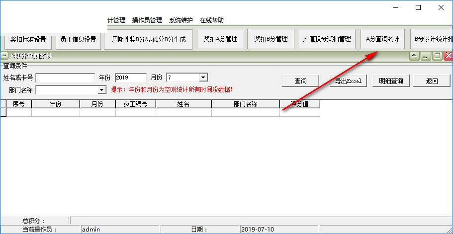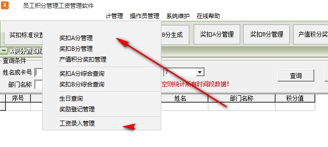 7、支持A分查询统计、B分累计统计排名、B分阶段性排名、员工工资管理