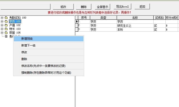 2、先选中下边列表框一项再新增,要进行修改或删除操作也是先在树形列表框中选择好记录,再操作!