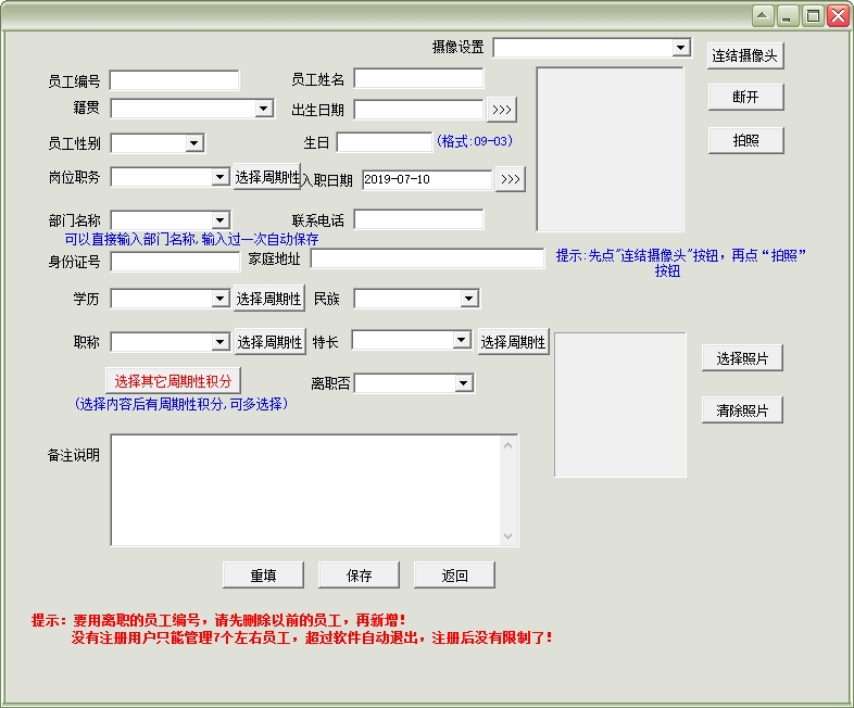 10、要用离职的员工编号,请先删除以前的员工,再新增!没有注册用户只能管理7个左右员工,超过软件自动退出,注册后没有限制了