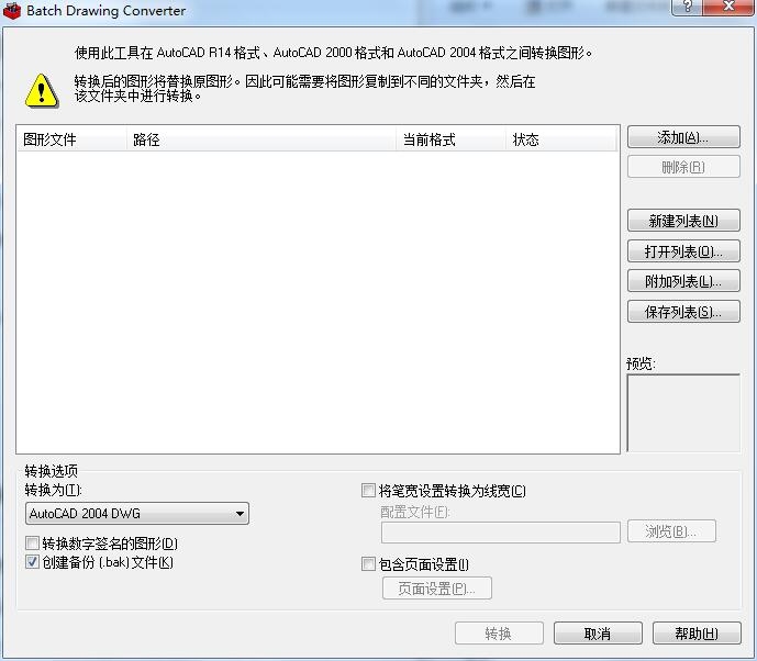 Batch Drawing Converter是款简单快捷的CAD版本转换工具;它是针对autocadR142000到2004之间格式转换开发,小巧的软件操作界面,让用户快捷的上手,并且笔宽转换成为线宽的功能支持,页面设置界面的增加,让用户转换过程拥有更多自主性,根据CAD版本图纸的需求,对转换的选项选择,最主要的是软件的使用,无需对auto软件安装,也没有安装步骤,打开就可以使用!