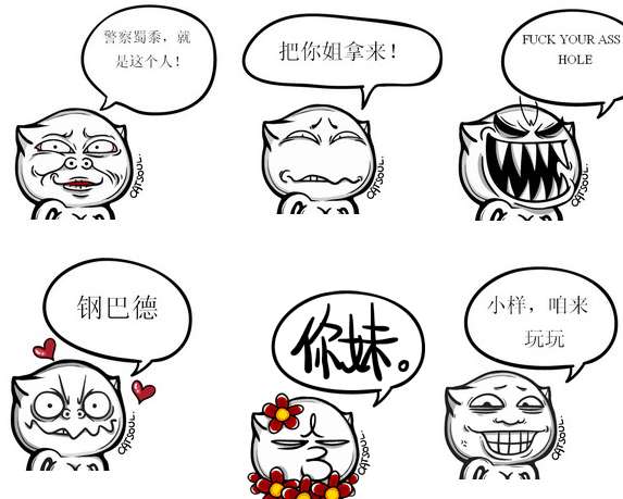 魂儿喵喵吐槽qq表情包,表情有:警察叔叔,就是这个人,把你姐拿来,FY ASS HOLE,钢巴德,你妹,小样,咱来玩玩,太枣糕了,菊花痒吗、客官精坷垃又拉了?欧巴桑,我什么都不知道,笑泥煤,便当了,踩爆你,这真是极好的,高清无马……