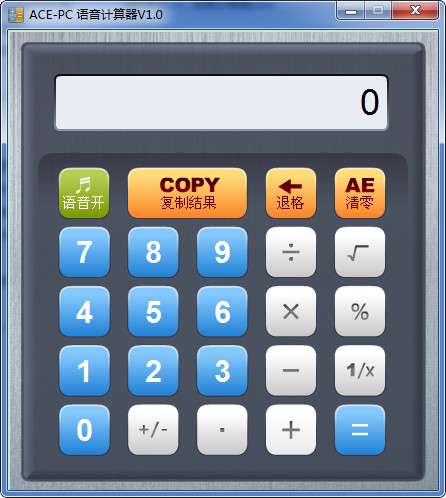 ace-pc语音计算器,按键后可以发音,打开后自动置顶。可以进行四则运算、开方、求余、分数计算。支持语音关闭。