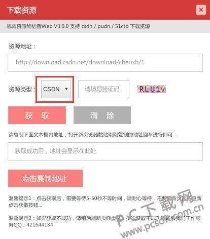 2、找到资源后,将资源页面体质复制到“资源地址”一栏,在资源类型选项下选择CSDN,然后输入验证码获取下载地??
