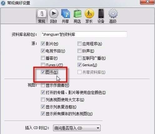 3、在“偏好设置”的“常规”一栏中,找到“源”里的“图书”并勾选上;
