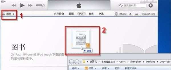 4、点击“图书”按钮,在工具栏上的“文件”中点击“将文件添加到资料库”将pc上事先下载好的图书添加进去或者直接将保存图书的文件夹打开,将下载的图书通过鼠标直接拖曳到iTunes中;