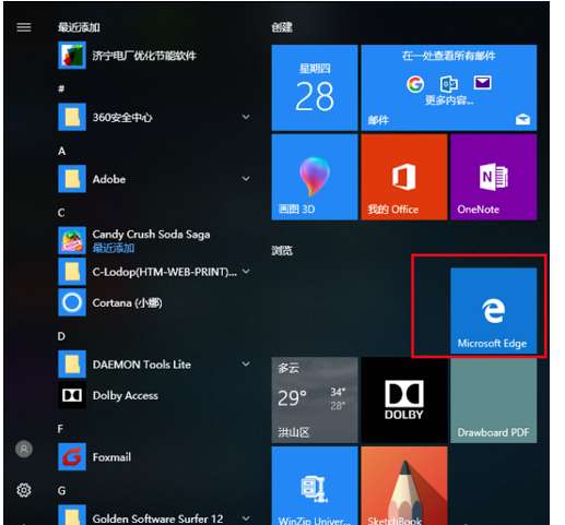 1、点击电脑左下角的的开始菜单,选择Microsoft Edge浏览器。