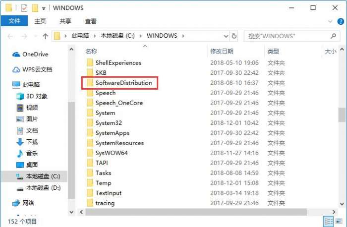 3、之后会打开一个新窗口,在此文件夹中找到名为“SoftwareDistribution”的文件夹,然后直接将此文件夹改名为“SDold”并确定。