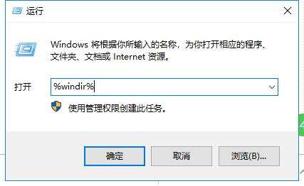 2、然后再次使用鼠标左键单击打开计算机桌面左下角的“开始”菜单,并输入“运行”两个汉字,单击打开搜索到的“运行”程序(或直接使用Win+R快捷键来打开)。在“运行”窗口的输入栏中输入“%windir%”并点击“确定”。
