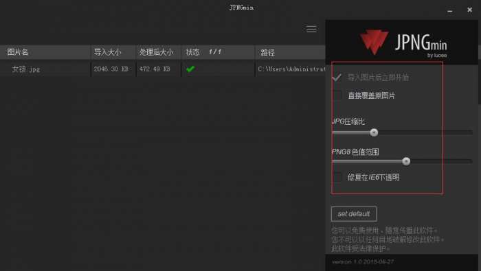 压缩后的图像,JGmin为您提供选项来输出图像到不同的文件格式,如JPEG,PNG或BMP。