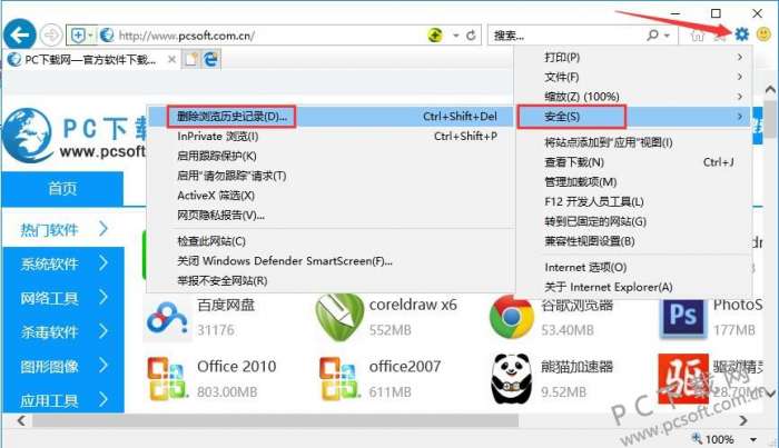 1、打开ie11浏览器,点击右上角的齿轮图标,将鼠标光标放在下拉菜单中的“安全”一栏,之后再点击打开子菜单中的“删除浏览历史记录”选项。