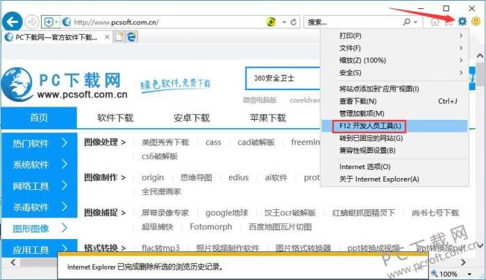 1、在打开ie11浏览器后,点击右上角的齿轮图标,然后点击打开下拉菜单中的“F12开发人员工具”。