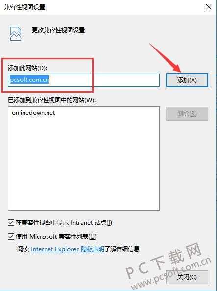 2、将需要使用兼容模式的网址链接输入到输入栏中,并点击后方的“添加”按钮即可。