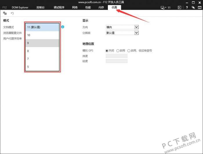 2、将新窗口切换至“仿真”标签页下,在“文档模式”一项后,即可设置为任意旧版本的ie浏览器模式了。