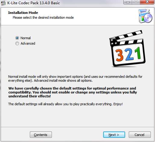 一般模式:所有选项(可选择是否安装 Media Player Classic 播放器) ,默认安装位置