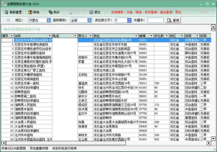 全国医院名录大全官方版是一款实用,详尽的医院名录合集。全国医院名录大全最新版汇集了全国数万家医院的详细信息,包括名称、地址、所在地区、联系方式、负责人、床位数、日诊断人数、技术及专长、简介、乘车路线等。全国医院名录大全官方版同时具有多条件组合查询、导出、分组、排序等功能。