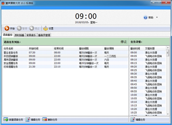 可分别设置音乐定时播音节目单和语音的定时播音节目单,且音乐和语音自动匹配,令整个商场音乐不断、气氛不歇