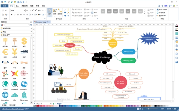 Edraw最大允许学生,教师和商务专业人士可靠地创建和发布各种图表表示任何意见。创建具有专业外观的流程图,组织结构图,网络图,商业演示,建筑图则,思维导图,时装设计,UML图表,工作流程,程序结构,网页设计图变得简单,电气工程图,定向地图,数据库图表和更多。大型预拉库和4600多矢量符号,绘图再简单不过了! Edraw最大允许您创建了一个直观的,熟悉的Office风格的环境中工作时使用模板,形状和绘图工具的图表广泛。