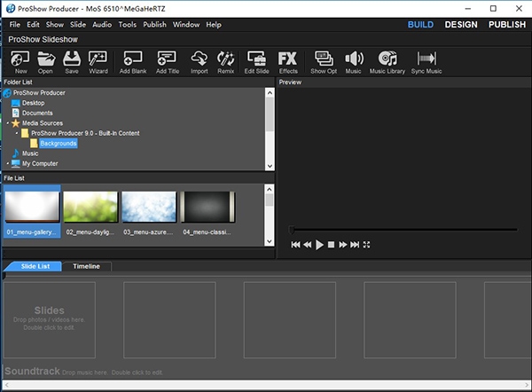 ProShow具有三个不同的工作区,您将用于创建和共享节目。工作空间是构建,设计和发布。每一个都将在下一章中更详细地介绍,但是因为它们都有稍微不同的选项,所以重要的是要知道每一个都做什么以及如何分辨哪个选择。